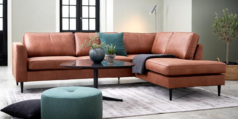 Houston sofaen er med chaiselong og i Kentucky stof i farven Cognac – og den giver et smukt og elegant look i din stue. Vil du læse mere om denne nøjagtige variant, kan du besøge vores blogindlæg om